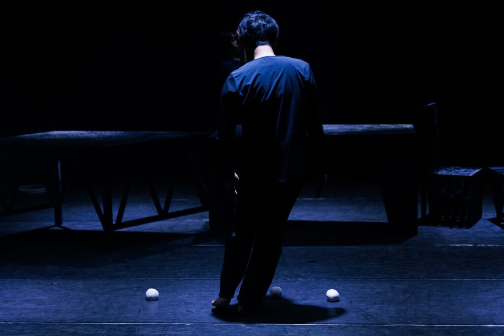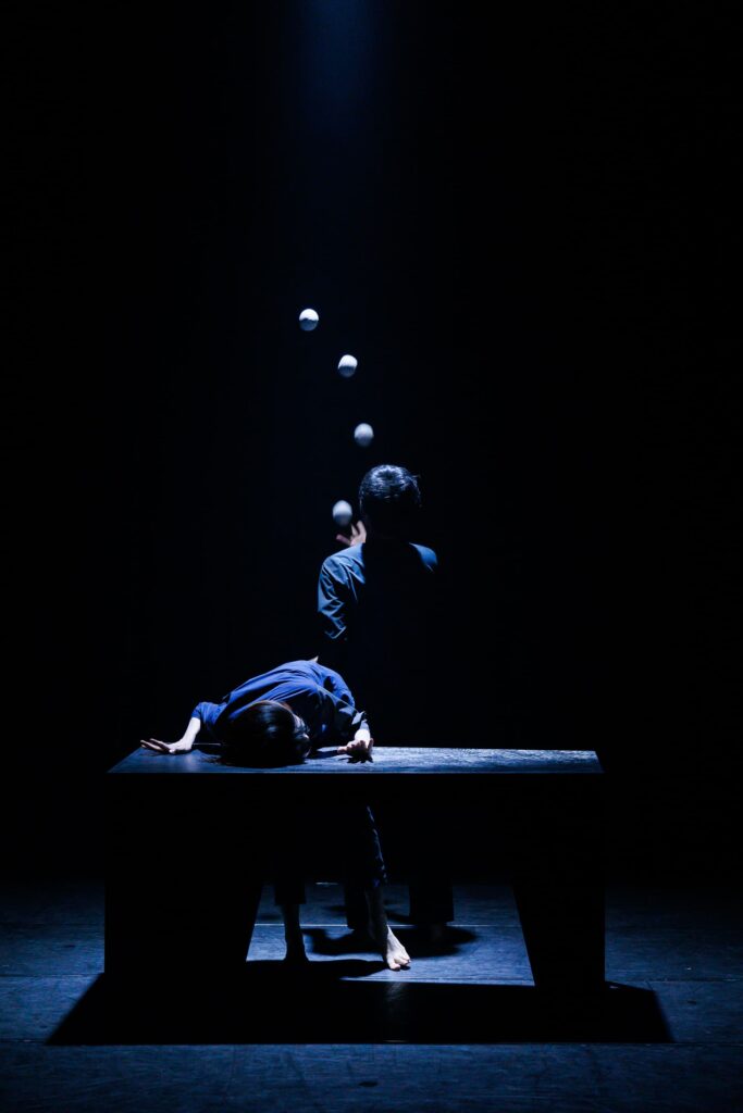 「そこにいる5人は、どこか皆孤独に見える。安岡あこと目黒宏次郎は、追いつ追われつ、高い身体能力を駆使して体当たりでぶつかり合う。入手杏奈と目黒陽介は、ボールを共有しつつも各々思う通りに動かしている。別々の軌道はやがて交差し、互いの領域を侵食し合う。対照的な2組を背にピアノに向かうイーガルは、全てを貫く時の流れを紡ぎ出す。間に置かれた4つの机と椅子はそれぞれ偏りのある台形で、彼らの分身のようでもある。」